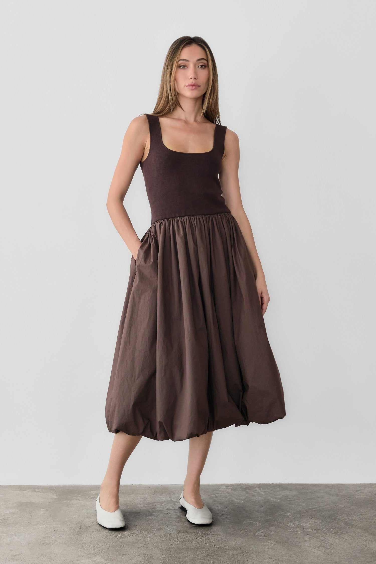 A midi-length dress designed with a distinctive round square neckline and hidden side pockets for a seamless, elegant silhouette. The bubble skirt adds volume and movement, making it the perfect choice for any occasion. Effortlessly transitions from day to night.