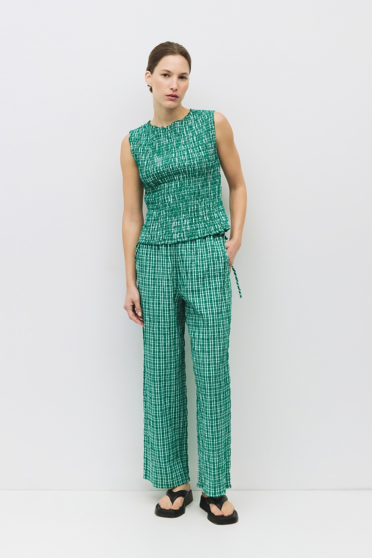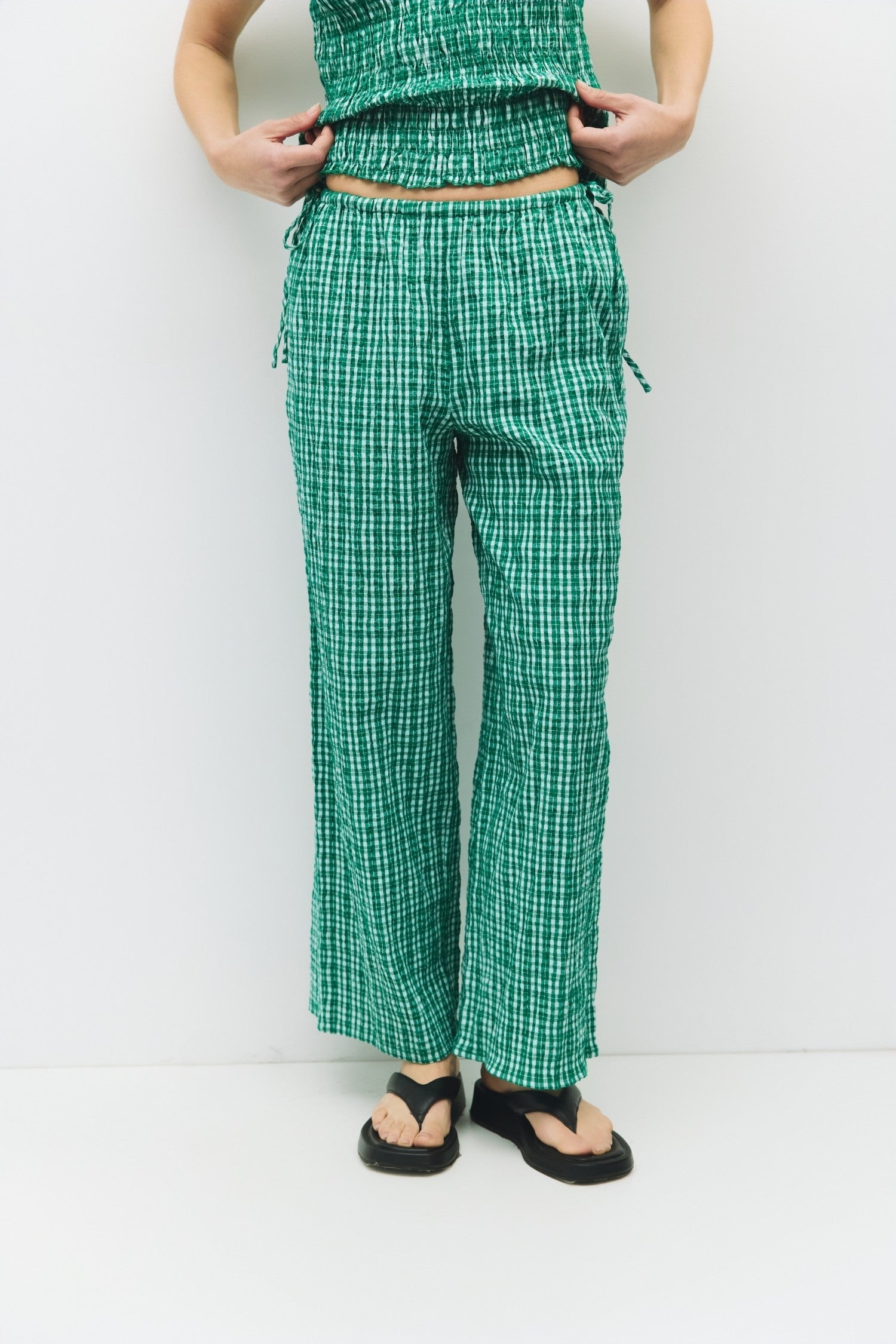 The Colette Pant is a relaxed, ankle-length style with a wide-leg silhouette and soft plaid fabric. Designed with an elastic waistband and adjustable side ties, it’s an easy, comfortable pick for everyday wear—especially when paired with the matching Colette Top.