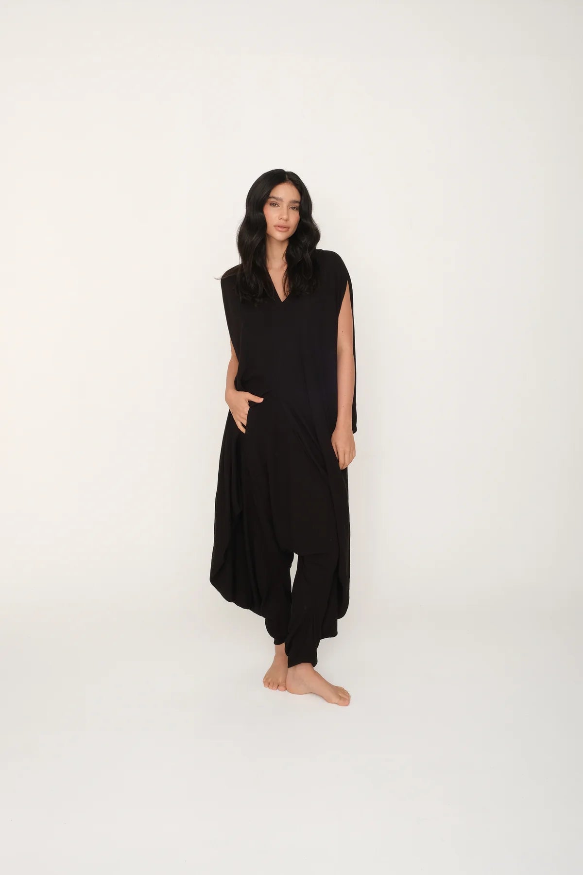 The MIaroma Jumpsuit is a fluid two-in-one design that blends comfort, movement, and elevated minimalism. It features a clean V-neckline, sleeveless shoulders, and a relaxed harem-style pant that drapes beautifully on the body. Functional front pockets and an elastic hem create a soft, sculptural silhouette that moves with ease throughout the day.