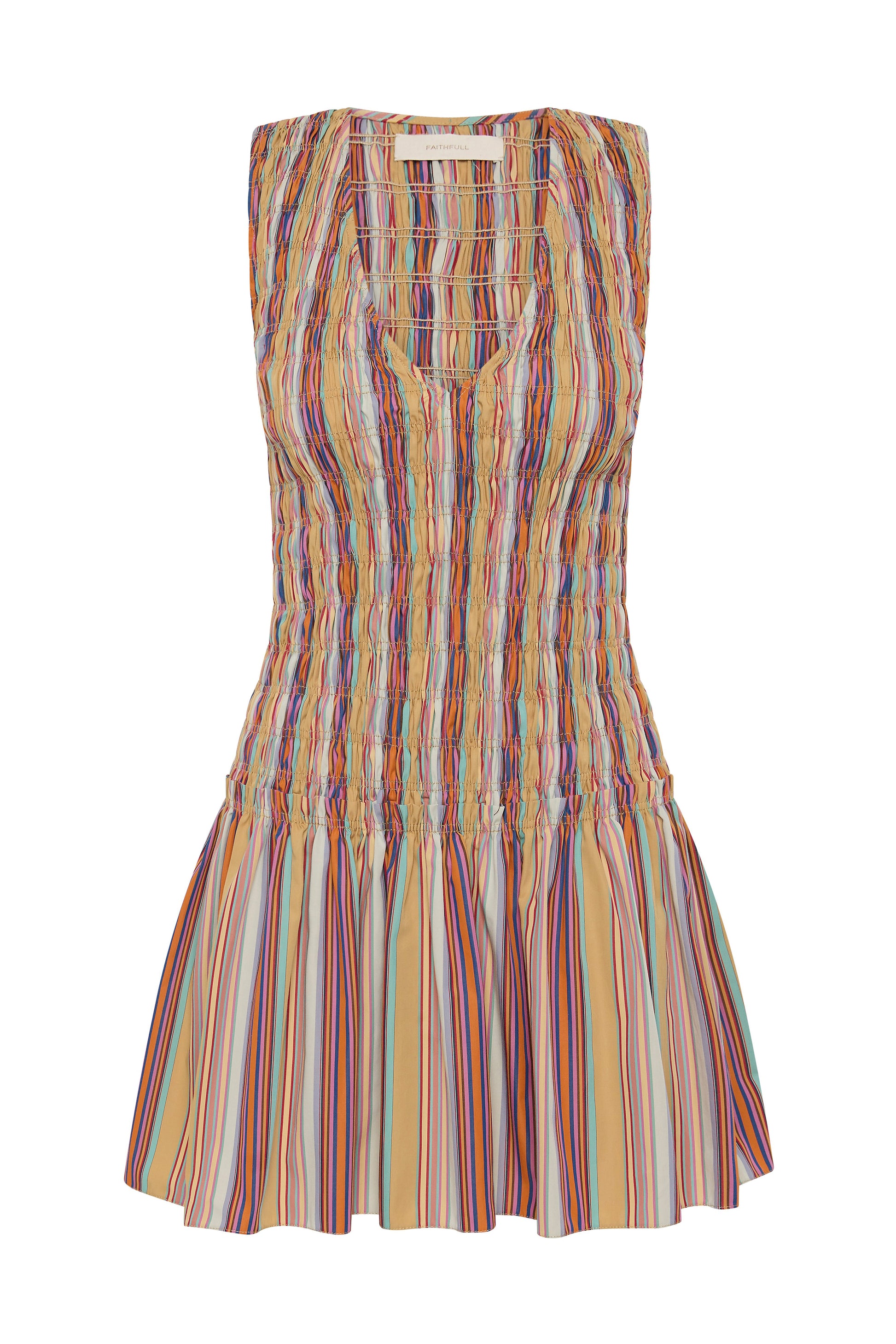 A summer mini dress, designed from a signature 100% BCI Certified organic cotton yarn-dyed in a warm mustard and mauve stripe, inspired by the colors of Mexico City. Sleeveless with a deep V-neckline, it is shirred through the bodice for a cinched silhouette, before flaring into a gathered A-line skirt. Lightweight with effortless appeal, it is the perfect vacation companion.
