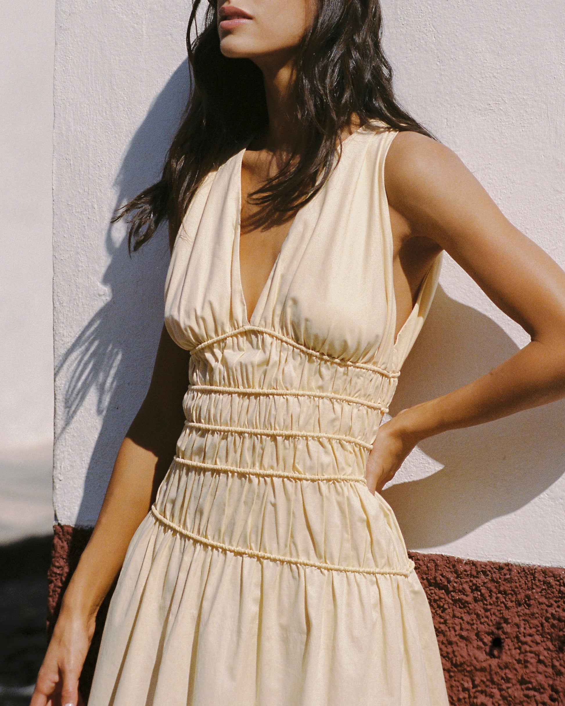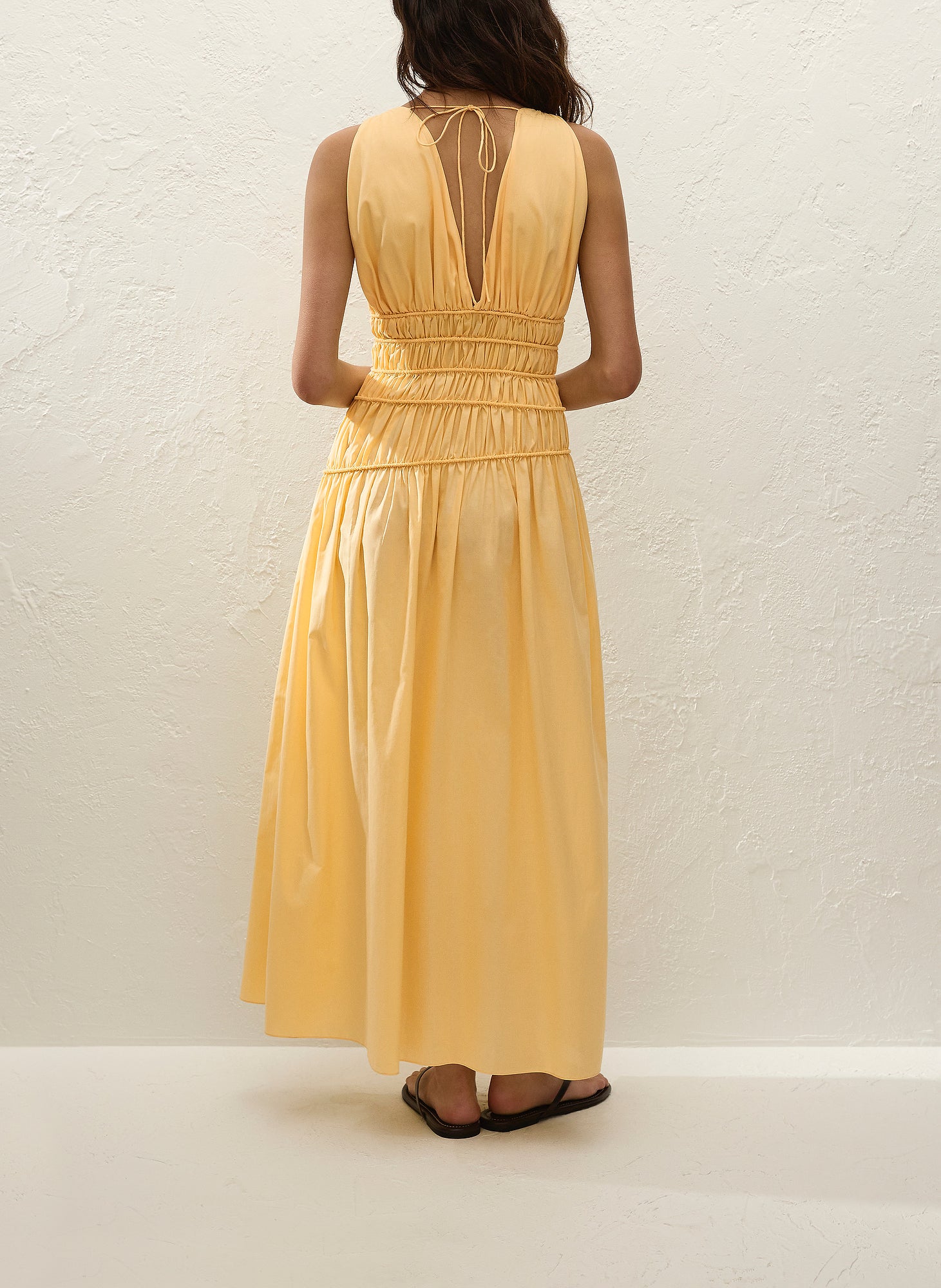 A vacation-inspired maxi dress, designed from a signature 100% BCI Certified organic cotton yarn-dyed in a warm yellow. It features a deep V-neckline through the front and back with an asymmetric elastic detail through the bodice for a cinched silhouette. From the waist it flared into a softly gathered A-line skirt. Style with a simple sandal for sun-drenched vacations.