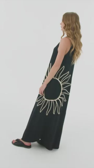 The Praia Maxi Dress is a flowy black dress crafted in a relaxed fit with wide straps and a V-neckline. Its standout detail is the sun-inspired embroidery in contrast stitching, giving the piece a bold and artistic touch. A statement dress for vacations, beach outings, or relaxed occasions.