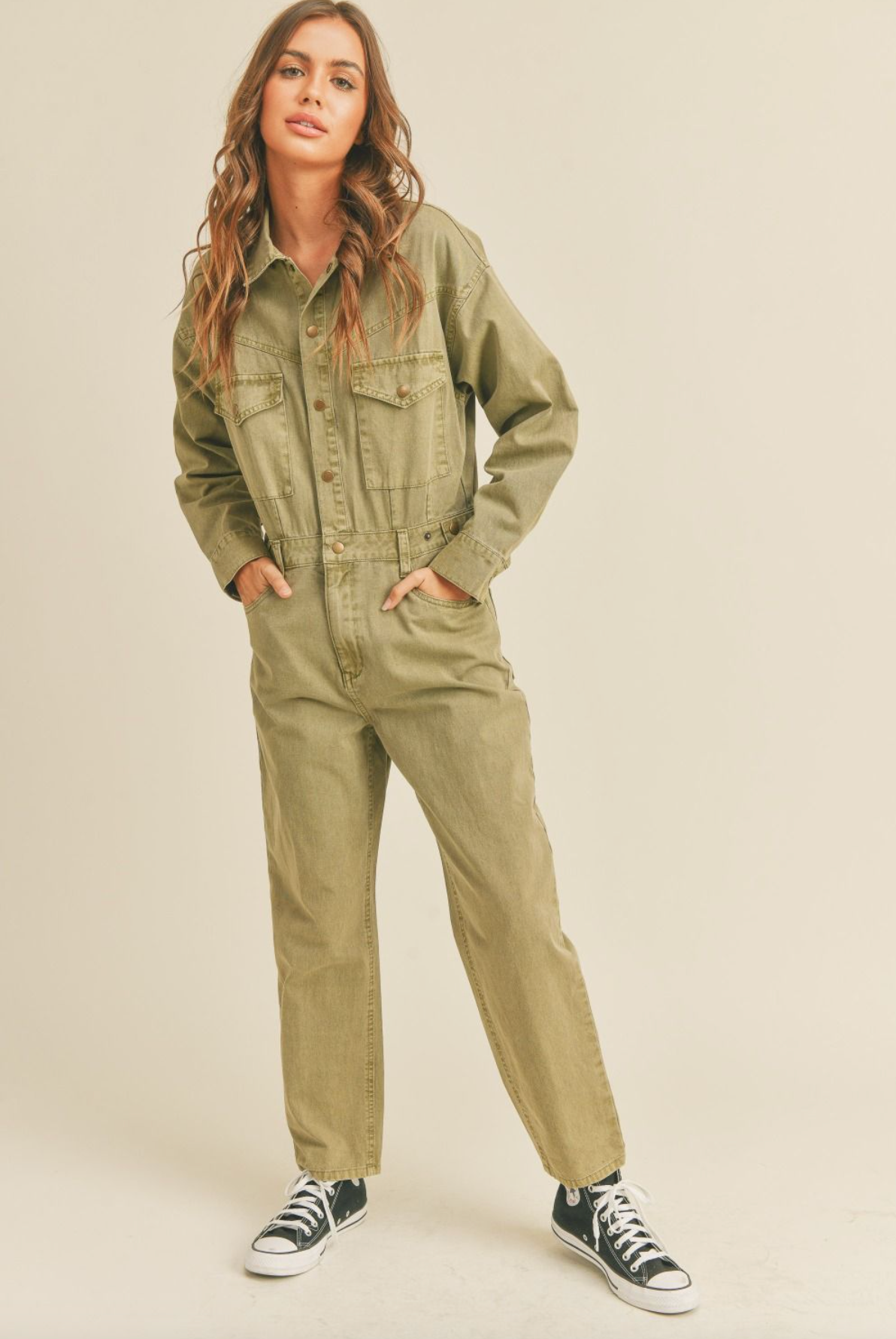 The Vanguard Jumpsuit, a structured yet effortless one-piece crafted from soft, rigid denim. Designed in a washed olive hue, it blends utility with understated edge—featuring crisp long sleeves, a defined waist, and functional pockets for a balance of form and function. Whether worn relaxed or cinched, this piece moves with confidence, just like you.